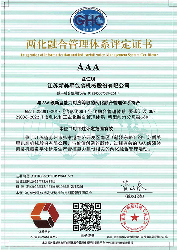 近日,新美星顺利通过《信息化和工业化融合管理体系 要求》(GB/T 23001-2017)及《信息化和工业化融合管理体系 新型能力分级要求》(GB/T 23006 -2022)体系认证,成为张家港市第3家获得AAA级认证的企业。AAA级是目前两化融合管理体系可申请的最高认证等级。这一权威证书的获得,标志着新美星信息化与工业化、数字化深度融合工作再上新台阶,有力推动了企业高质量发展。