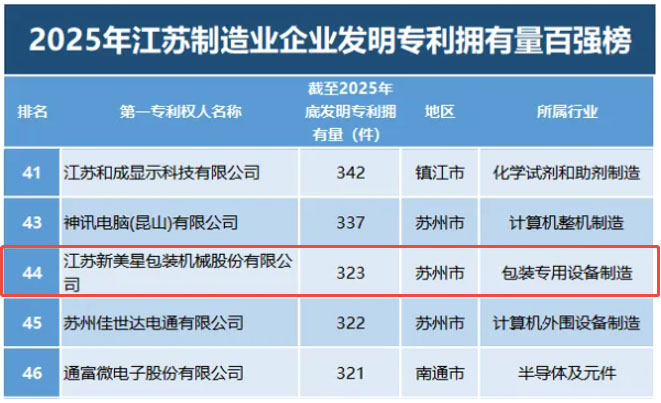 春回大地,好消息传来!2025年江苏制造业企业发明专利拥有量百强榜正式揭晓,新美星凭借深厚的技术积淀与强劲的创新势能,不负众望成功登榜!这是新美星自2022年起,连续4年荣登该榜单,用实力续写创新传奇,在包装专用设备制造领域的创新赛道上持续领跑、一马当先!